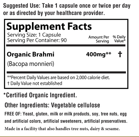 Ingredients: Organic Brahmi (Bacopa monnieri), vegetable cellulose capsule.
