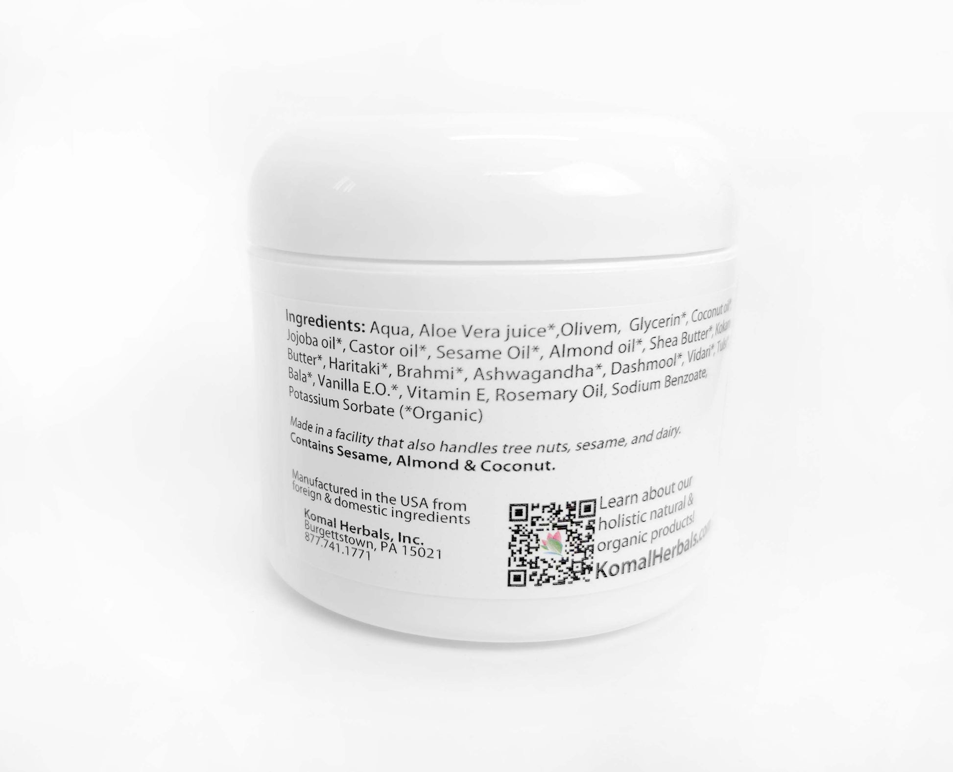 Ingredients: Aqua, Aloe Vera Juice*, Olive Oil Ester, Glycerin (Vegetable)*, Coconut Oil*, Jojoba oil*, Castor oil*, Radish Root Ferment, Lactobacillus and Cocos Nucifera (Coconut) Fruit Extract, Sesame Oil*, Almond Oil*, Shea Butter*, Kokam Butter*, Haritaki*, Brahmi*, Ashwagandha*, Dashmool*, Vidari*, Tulsi*, Bala*, *, Lemon crystals*, Vanilla E.O., Vitamin E, Rosemary Oil*. (*Organic)