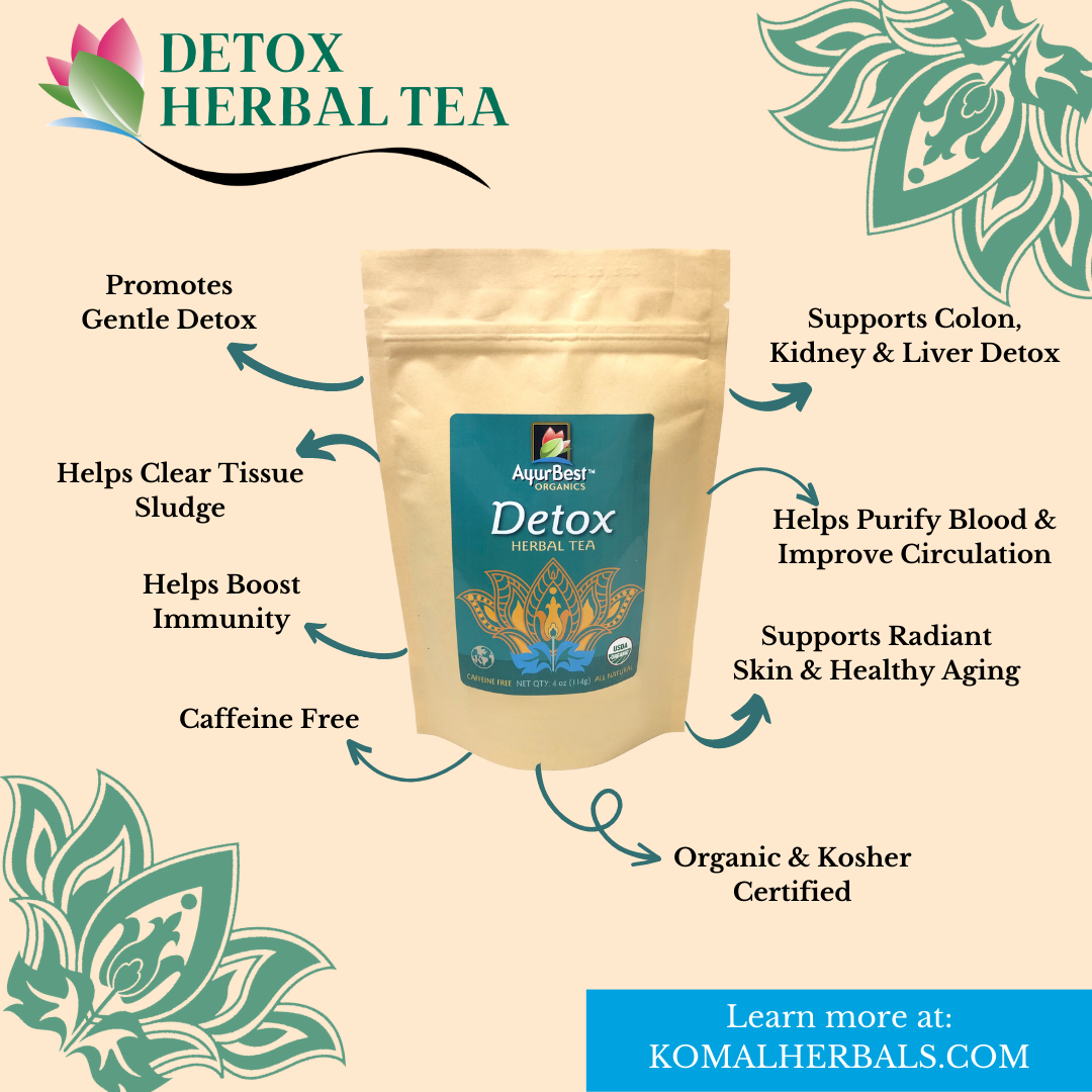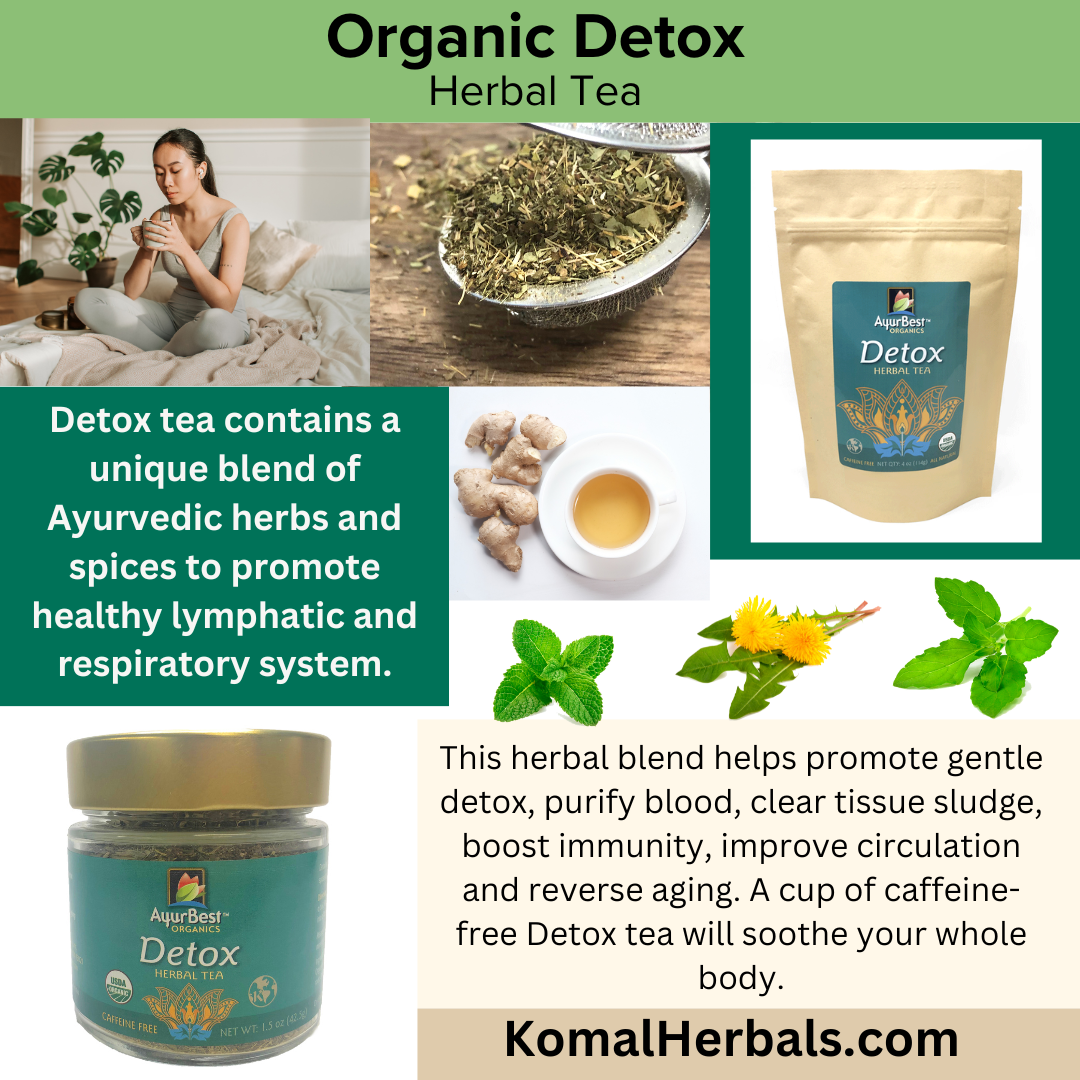 Detox tea contains a unique blend of herbs and spices to promote healthy lymphatic and respiratory system. It's a naturally caffeine free herbal tea made with 100% Organic certified ingredients.