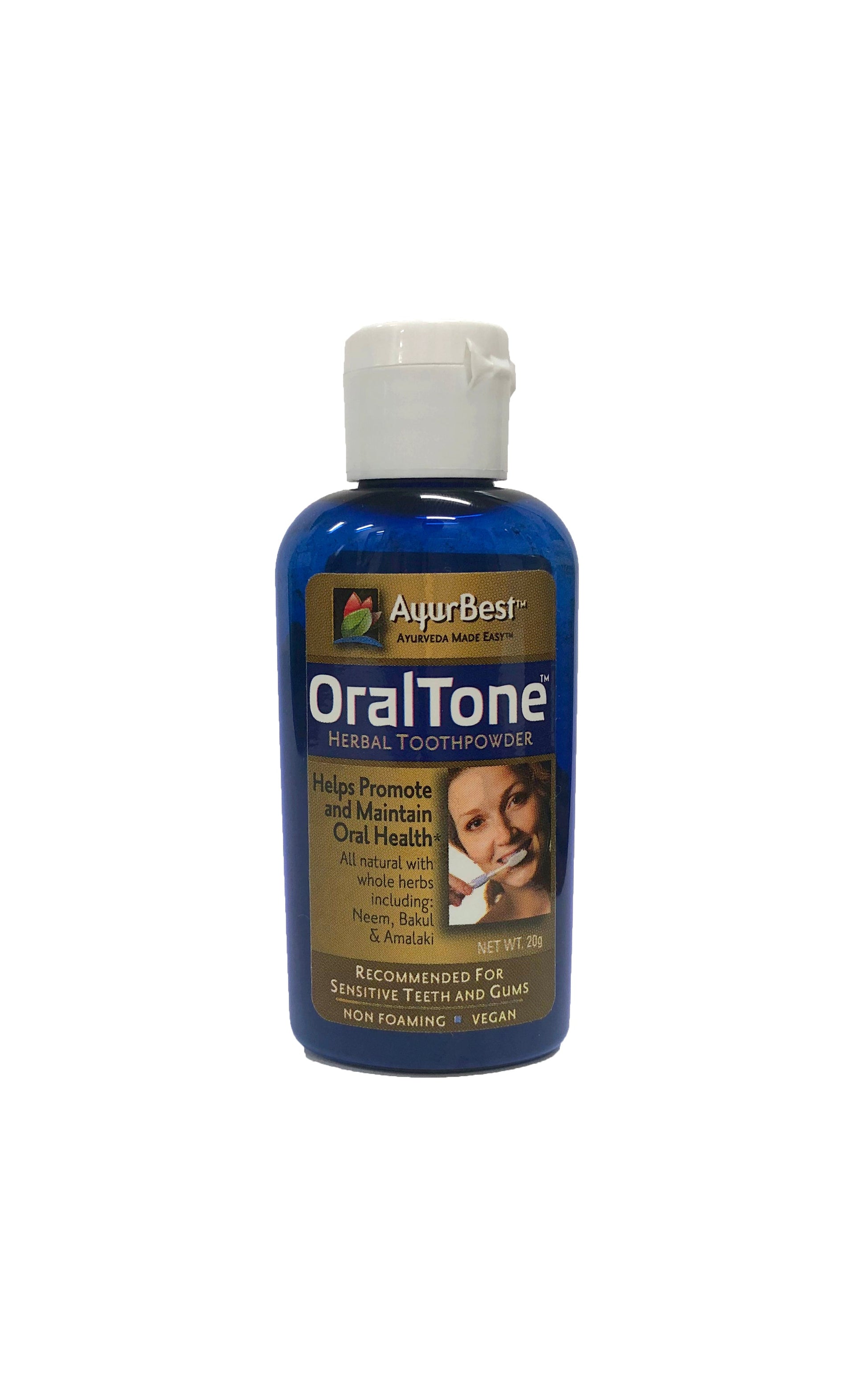 AyurBest OralTone is an all natural dental powder.  It has a proprietary blend of many herbs and minerals like Bakul, Neem, Triphala, Rock salt which have been used traditionally to promote oral health. It can be used daily for a healthy smile.